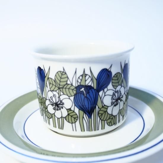 ARABIA社を代表するデザインの一つとしてとても人気の高いシリーズがこちらのkurokusのシリーズです。クロッカスの花が全体に描かれていて、ベースのグリーンと差し色にもなっているブルーの配色がとても美しいです。こちらのシリーズは他にもモノクロとグレーが作られています。製造期間も2年間と短さやデザイン人気もあり、いまではとても希少性の高いシリーズとなっています。